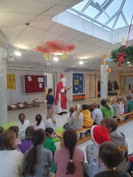 Auch dieses Jahr stattete der Nikolaus der Grundschule einen Besuch ab. Voller Vorfreude versammelten sich alle 1/2-Klassen in der Aula und warteten gespannt auf den besonderen Gast. Nach der Geschichte vom heiligen Nikolaus erhielt jede 1/2-Klasse ein besonderes Lob und einen großen Sack mit Leckereien für jedes Kind.