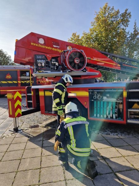 Und es ging auch noch hoch hinaus! Mit der Drehleiter fuhren mehrere Einsatzkräfte bis zu 30m in die Höhe. Und siehe da – auf das Rufen der Kinder mit „Wasser marsch“ löschten die Feuerwehrmänner aus der Höhe das Schuldach (das Gott sei Dank nicht tatsächlich brannte, aber eine Dusche kann auch nicht schaden). Der Neid stand schon einigen ins Gesicht geschrieben, als Frau Geiger, die Rektorin der Schule, und einige andere Lehrkräfte auch noch mit der Drehleiter in die Höhe gefahren wurden. Ganz schön schwindelerregend – nur vom Zusehen!