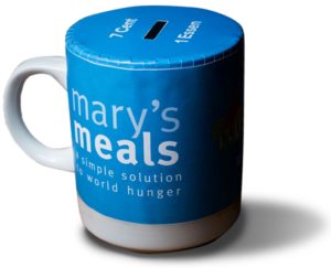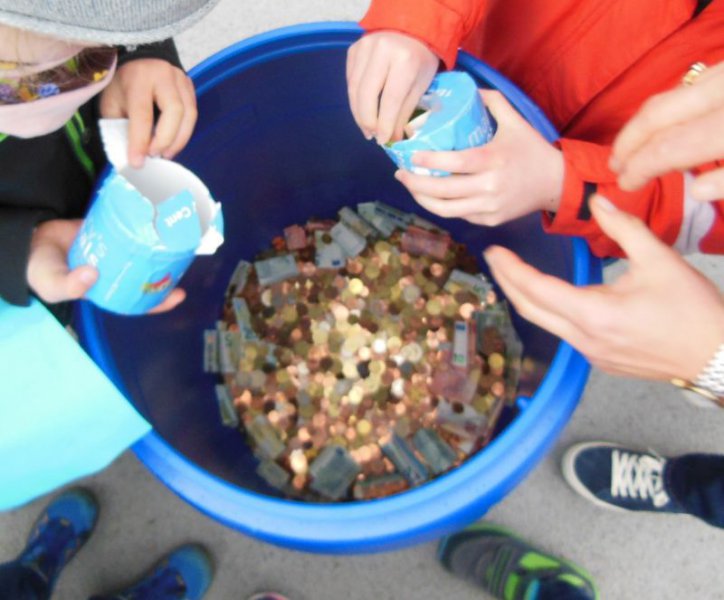 Mit der Tassenaktion von Mary´s Meals war dies kinderleicht. Nur ein paar Handgriffe waren nötig, um eine normale Tasse in eine Spendentasse zu verwandeln. Dazu bekam jedes Kind die benötigten Aufkleber und konnte in seiner Familie bis Anfang April Spenden sammeln. Am 8. April trafen sich dann alle Schüler und Schülerinnen im Pausenhof der Grundschule Mering Luitpoldstraße um den Inhalt ihrer kleinen Tassen in eine riesige Tasse zu schütten. So kam am Ende eine wertvolle Füllung zusammen und es konnten ca. 4600€ an Mary´s Meal übergeben werden. Nun dürfen sich fast 300 Kinder im nächsten Schuljahr auf eine warme Mahlzeit pro Tag freuen – ein Gedanke, der Mut macht, und eine Aktion, auf die alle Schülerinnen und Schüler stolz sein können.
