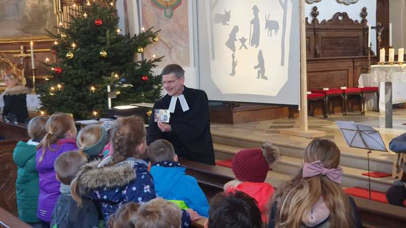 Gespannt lauschten die Kinder der besinnlichen Geschichte „Der kleine Hirte und der große Räuber“, die bildlich in einem Scherenschnitt dargestellt wurde.